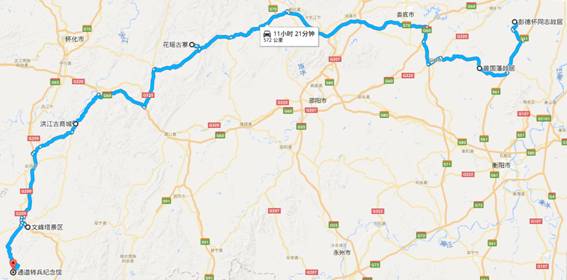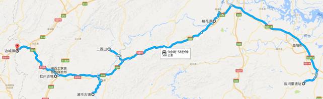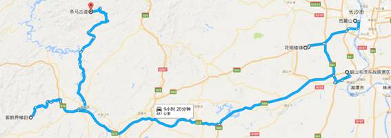 長沙(嶽麓山、橘子洲)【53分鐘(44.1公里)花明樓收費站】——寧鄉(灰湯、花明樓)【37分鐘(35.7公里)韶山收費站】——韶山(毛澤東故居、紀念館)【3小時 6分鐘(204公里)紫鵲界收費站】——新化(紫鵲界梯田、梅山龍宮)【4小時 12分鐘(148公里)新化收費站】——安化(茶馬古道、黑茶博物館)