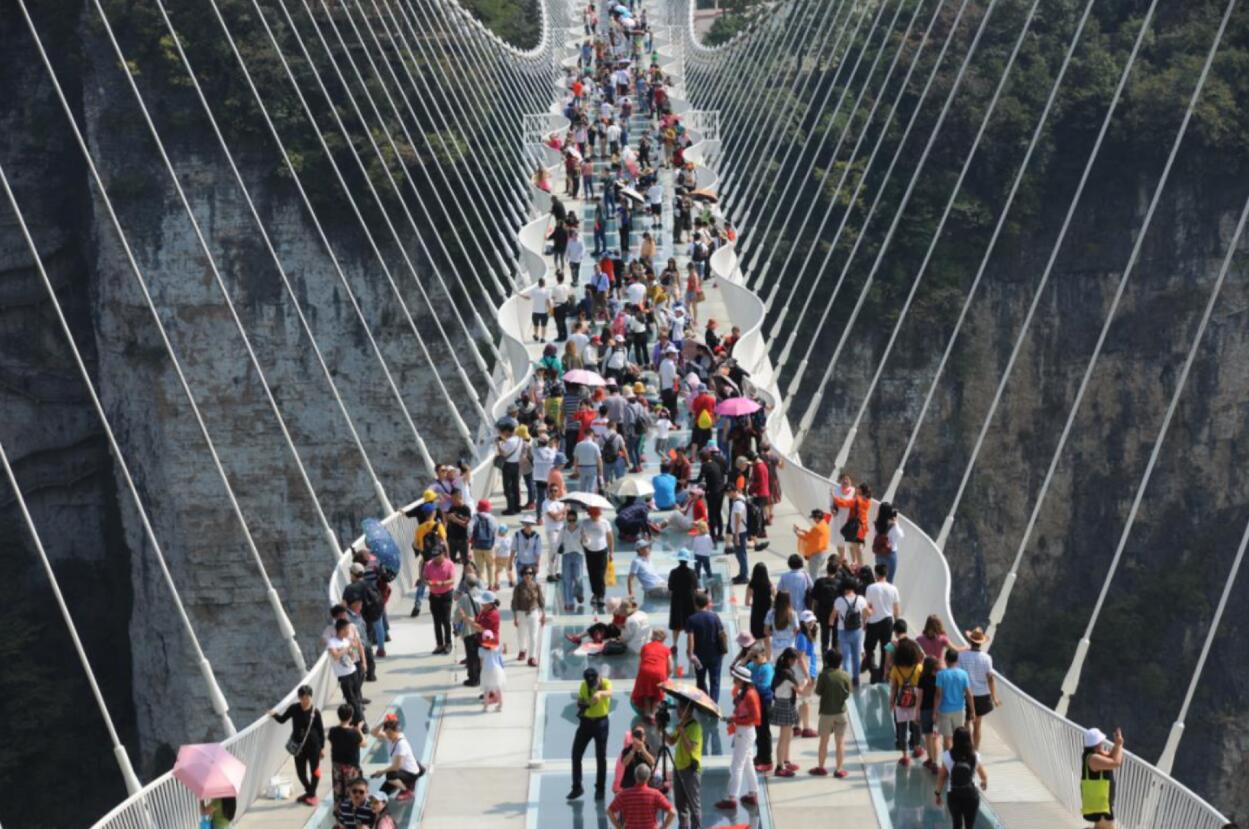 張家界大峽谷是一個新近開發建設的旅遊景區,其高空峽谷玻璃橋以「凌空漫步,如履薄冰」的驚險體驗成為遊客出遊的「網紅」景點,吸引各地遊客紛至沓來。全長430米,橋面寬6米,橋面距谷底約300米的大峽谷玻璃橋,是目前世界最長、最高的全透明玻璃橋及世界首座斜拉式大變量空間索玻璃弔橋,擁有十項世界第一,更具有蹦極、溜索、舞台表演等多種功能,國內外橋樑專家評價稱「張家界大峽谷玻璃橋是世界橋樑建築史上的奇蹟」。