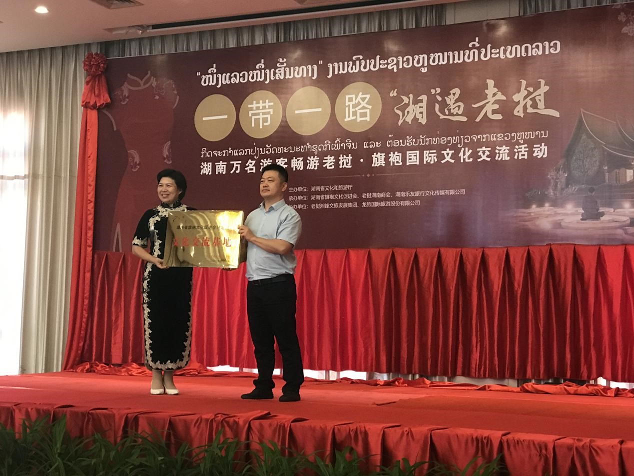 活動期間,湖南與老撾雙方互贈了滿載誠意、富有特色的禮品。現場還舉行了湖南省旗袍文化促進會駐老撾文化交流基地授牌儀式,搭建起了湘老服飾文化交流的重要平臺和弘揚中華優秀文化的重要視窗。據瞭解,未來,基地將以旗袍為紐帶,凝聚各界婦女,彰顯旗袍之美,弘揚中華優秀傳統文化,加深湘老雙方文化旅遊交流與交往。
