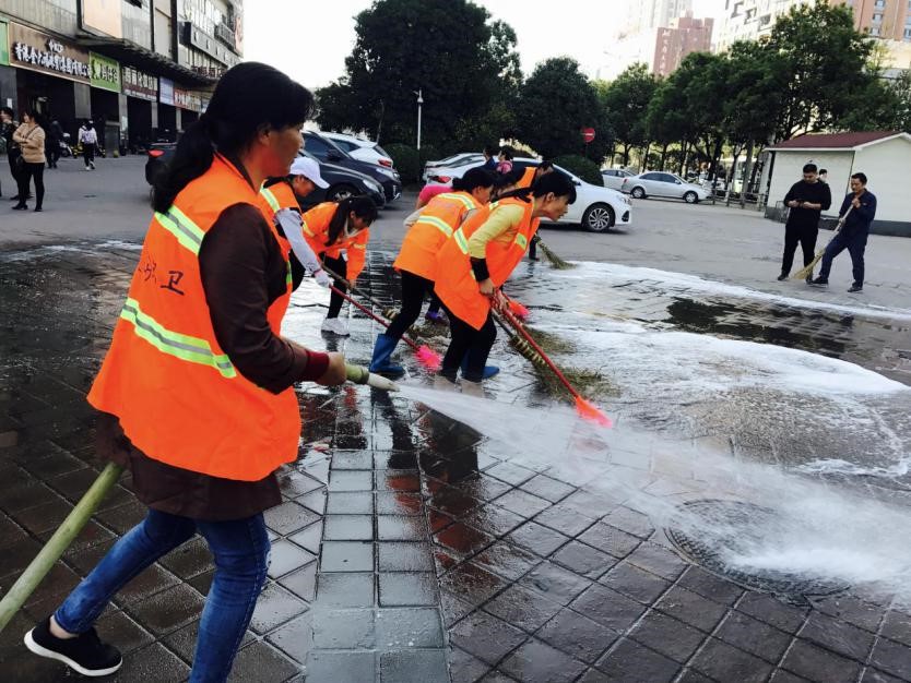 首先,每天堅持對全市主次幹道、重點區域、農貿市場周邊進行深度清掃清洗保潔。
