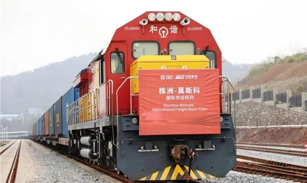 3月14日,湘歐快線國際貨運班列從湖南株洲中車株機物流基地啟程,沿着「絲綢之路經濟帶」開往莫斯科。
