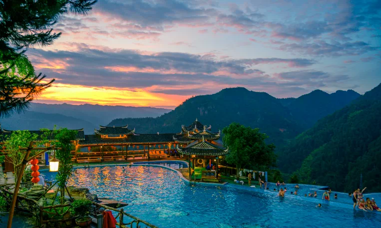 玩的方面,有建在懸崖上雲端瑤池,讓您嘻浴山泉,嗨泳仙境。從天而降的雲端滑道,掛在雲端的山鬼玻璃橋、龍鳳玻璃觀景台,讓您有驚無險漫步雲端、光速穿越溝壑叢林,隨風尖叫,快意涼爽。還有新開張的旺溪瀑布群景區、雲端森林兒童樂園的音樂噴泉,讓遊客密林中溯溪,在瀑布下戲水。