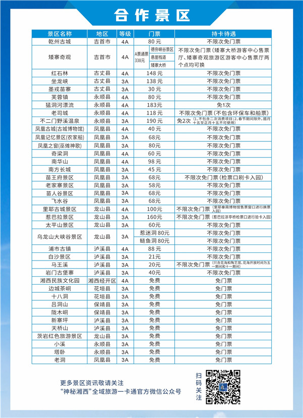 該卡對外售價198元/張,在一年有效期內,持卡者可享受湘西自治州所有35家A級旅遊景區免票待遇,單次使用景區門票價值高達2567元,同時可獲得酒店、民宿、餐飲等加盟商戶折扣優惠,總價值3000元以上。持卡可讓旅遊者實現“一卡在手,暢遊湘西”,去領略中國最美麗的小城鳳凰、“掛在瀑布上”的芙蓉鎮、“刻在秦簡上”的裡耶古城、體驗“天下第一漂”猛洞河漂流,以及世界最大的鋼桁梁懸索橋——矮寨大橋等景區點。