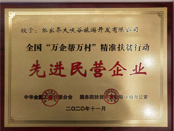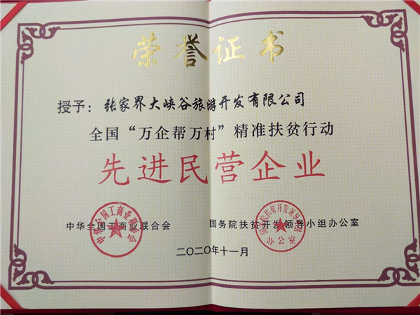 2020年11月,湖南張家界大峽谷旅遊開發有限公司獲得由中華全國工商業聯合會、國務院扶貧開發領導小組辦公室授予的全國“萬企幫萬村”精准扶貧行動先進民營企業表彰,這是2020年湖南唯一一個獲授本次榮譽的旅遊企業。