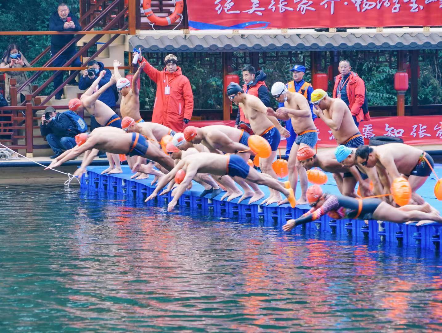 賽事吸引了來自湖南省各市州、廣東、浙江、福建、貴州、河南以及相關企業代表隊的近千名冬泳愛好者參加。 張家界作為聞名於世的旅遊勝地,有著得天獨厚的山水美景、寶峰湖更是集張家界地貌、高峽平湖民俗風光一體,是張家界山水的完美結合。