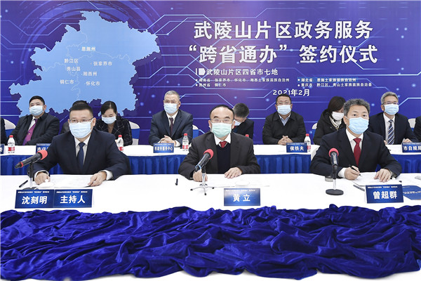 2月8日,湖南、湖北、貴州、重慶四省市七地以「雲簽約」形式,在張家界主會場和各地分會場同時舉行了武陵山片區政務服務「跨省通辦」簽約儀式,標誌着武陵山片區政務服務進入新模式。