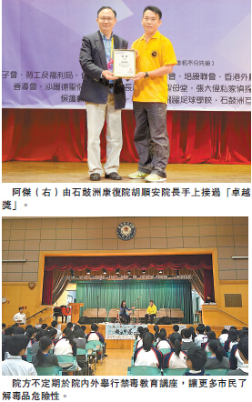 今次獲頒發課程證書的阿傑曾經隱蔽吸毒近20年,去年入住石鼓洲康復院治療,不但成功戒毒,期間,參加院方舉辦的建造業議會工藝、基本技能訓練、展台建造及布置和品格訓練等多個課程,獲得9項專業課程考試的證書,成為參加院方職業技能訓練課程的學員中,獲得培訓課程證書最多的學員,故在當天證書頒發典禮上,獲頒「卓越獎」。