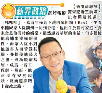 家長希望子女贏在起跑線,長大之後即使不是飛黃騰達,也可以成為一名專業人士。Ben小時候居住在木屋區,鎔時的娛樂是耕田、養豬、養鴨、養鵝、養狗等,不像現在的小孩那麼多課外活動,練成十八般舞藝。但他認為,正是小時候的這些經歷,豐富他的人生閱歷,鍛煉出他堅強的意志,才成就出今天的陳恒鑌。