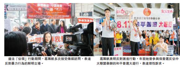 部分激進勢力鼓吹「港獨」。她留意到有激進派想借助是次選舉宣揚「港獨」,甚至希望進入立法會,以更激烈的行動抗爭,聲言要「占領立法會」;她贊同當局今次選舉要求參選人簽訂確認書的做法,認為有必要制止「港獨」人士參選,進而入議會搞亂香港;她又認為大部分市民都認同香港是中國的一部分:「香港人就是中國人,大部分市民不會支持『港獨』,并希望維持『一國兩制』、『港人治港』、高度自治。」