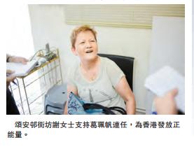 謝小姐居住在頌安約18年,她對於葛珮帆競逐連任新界東立法會議員,斬釘截鐵地投下贊成一票,又感激她成功爭取興建馬鞍山海濱長廊,及頌安區內的輪椅上落設施。謝小姐認為葛議員在地區工作上,比起其他當區議員更勤力,跟進問題方面處理更迅速,而且謝小姐在葛議員有需要的時候,更會充當義工,落手落腳幫助。謝小姐除了希望葛珮帆成功連任外,亦希望有更多充滿正能量的議員進入議會。