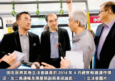 田北辰今屆爭取連任新界西議席,對於政府陸續發展新界西,相信當區人口亦會陸續增加。他認為,目前新界西最急需改善交通及醫療兩大問題,因現時有不少居民也需跨區工作,每天早上的屯門公路、鐵路也同樣變得擠塞,若然不改善交通情况,路面交通亦會面臨飽和,當發展后,只會變得更加擠塞。他亦提出爭取輕鐵與重鐵擠迫率劃一,以每平方米站立4人計算,并要求港鐵在輕鐵的繁忙時間、繁忙路線全部以雙卡車行駛。