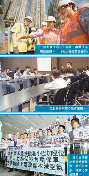 身為立法會交通事務委員會主席的田北辰,對交通運輸事宜熟悉不過,在今次的參選政綱中,繼續以交通、鐵路、教育為主打議題。在交通方面,他指,因新界西有不少居民也是跨區工作,故在上下班時間,屯門公路、港鐵也變得十分擠塞,部分人更要等數班車才能成功上車。在今次的政綱中,他提出爭取巴士月票,惠及前往九龍及港島上班的新界西長途乘客,又要求政府盡快批准九巴所有市區線轉乘機場A線只需補差價的申請。至於鐵路方面,他亦提出應盡快興建第5條跨海鐵路,連接新界西、大嶼山、交椅洲至港島,相信可以解決「逼爆」西鐵、屯門公路的情况。