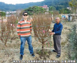 在香利花園所見姓林客戶正在仔細觀看一棵桃花,他表示,這棵樹是買下來的,他已連續7年在此預訂桃花,笑言,不敢講是否有什麼「桃花運」,但年年看見桃花開,全家人都很開心。現時,他和太太賦镕,所以有時間,10天或半個月就來看看桃花的生長情况,現時,有部分桃花開着,色澤很靚,待節前擺放屋企客廳之中,當所有枝頭桃花開時,會邀親戚朋友來賞花,分享花開富貴。