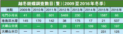 「越冬斑蝶調查」自2009年開始,持續進行8年。綠色力量高級環境事務經理單家驊表示,屯門小冷水的越冬斑蝶數量每隔數年便會突然攀升,通常在數量大幅上升後的翌年,亦會錄得顯著下降。例如2012年冬天錄得5000多隻,比對上一年數目大增8倍,之後一年冬天便大幅下降至200多隻。2015年冬天錄得1000多隻越冬斑蝶,比對上一年數目大增近40倍,故2016年冬天又再錄得越冬斑蝶數量大幅下降。