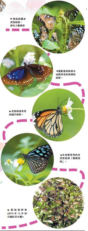 單家驊指越冬斑蝶分老虎型和烏鴉型,本地較常見的老虎型斑蝶有擬旖斑蝶、絹斑蝶、青斑蝶和虎斑蝶;本地較常見的烏鴉型斑蝶有藍點紫斑蝶、幻紫斑蝶和異型紫斑蝶。雖然香港面積不大,但不同越冬地亦有不同的主要斑蝶類型和物種。2016年於深水灣記錄的越冬斑蝶,由以往老虎型斑蝶佔多數,變成以烏鴉型斑蝶為主,更差不多全是烏鴉型斑蝶的藍點紫斑蝶,顯示2016年出現在深水灣的越冬斑蝶以單一物種為主。