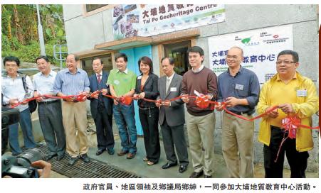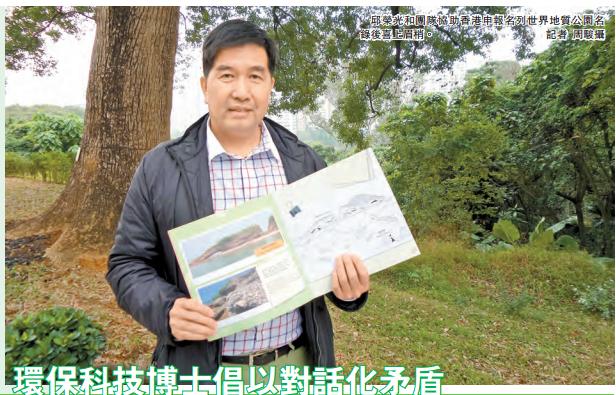 邱榮光講到另一項環保工作:保育香港漂亮的地質、地貌,但是,當年港英政府不注重而未有理睬,2008年政府環境局有意將香港申請為國家級乃至世界級地質公園,申辦其中條件是要求必須是民間設立地質教育中心和宣傳,而非政府出資建地質教育中心,故他和同行說服一間銀行資助一個項目約40萬元資金,加上地區捐出5萬元,用於三門仔設立的「大埔地質教育中心」,令香港申請到國家級,再申請世界級評定時,地區項目一欄中民間設立地質教育中心和宣傳佔了很多分數,也是評級的決定因素,而他和同行能幫香港拿到世界級的榮譽感到開心。