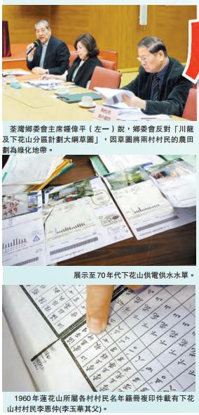 近日,荃灣鄉委會主席鍾偉平在鄉議局會議上提出,該鄉委會反對「川龍及下花山分區計劃大綱草圖」,原因是荃灣下花山原居民村的村民對於城規會大綱草圖刊憲,計劃中包括「約186.75公頃的用地劃為『綠化地帶』」表示反對。前原居民村長李玉華直言,清朝至今,下花山村李氏宗堂、祖屋及所有註冊農地,現在都被城規會規劃為「綠化地帶」。他質疑作為城規會成員之一的政府地政部門官員,在制訂這類計劃大綱草圖時罔顧下花村一直存在的事實。