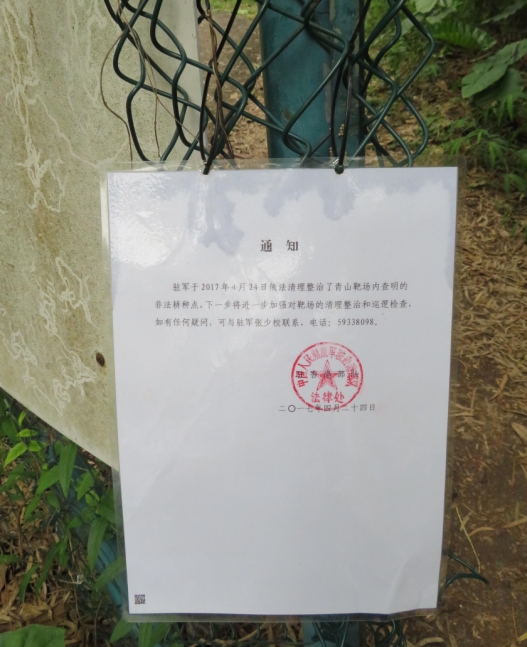 周前的一個中午,記者到訪鄰近屯門良景的青山靶場入口,發覺閘門雖關上,但市民無視閘上「軍事禁區不得擅入」的警告牌,依然循閘旁已破損的鐵絲網進入靶場行山。有良景居民對記者表示,上月24日起,解放軍曾在閘口駐守了幾天,勸退欲進入靶場的市民,之後就沒有出現,「人照樣入去,鐵絲網之前已爛,半夜畀人整爛」。閘口亦掛有通知,指依法清理非法耕種點後,下一步將進一步加強對靶場的清理整治和巡邏檢查。