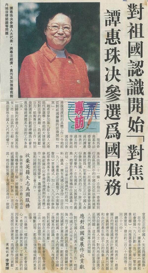 採訪中,譚惠珠希望港人特別是年輕人,要立足香港、放眼國家,在「一帶一路」建設、粵港澳大灣區發展中抓住機遇,融入國家發展大潮。她寄語年輕人要多認識日益強大起來的祖國,多認識《基本法》及「一國兩制」,要了解到香港及自己的前途始終與祖國連在一起。