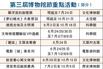 【香港商報網訊】記者葉佩瑜報道:康文署昨公布,第3屆博物館節將於6月24日至7月9日舉行,這是慶祝本港回歸20周年的重點項目之一,近百項活動分為4個類別,穿梭4個展覽,包括:「八代帝居—故宮養心殿文物展」、「羅浮宮的創想—從皇宮到博物館的八百年」、「永生傳說—透視古埃及文明」及「萬壽載德—清宮帝後誕辰慶典」。其中康熙萬壽無疆朝服、乾隆為母親六十大壽所畫的「蘭殿延禧」第4卷長卷等,都是首次來港展出。署方預料可吸引30萬人次的市民及遊客參觀。