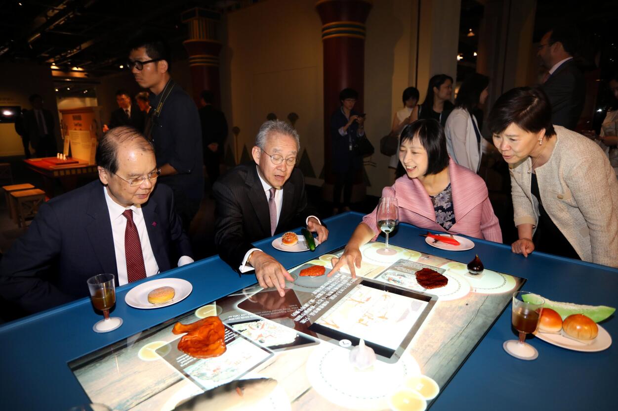 马会副主席周永健(左二)及政务司司长张建宗(左)在场试玩游戏“共进佳肴”,了解古埃及人口味。