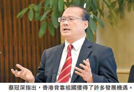 在蔡冠深看來,連續20多年被評為全球最自由經濟體,開放的香港賴以成功的因素就是全球精英人才和資金的匯聚,內地當然也是其中重要的來源。在「一國兩制」和《基本法》的保障下,香港背靠祖國,獲得了許多發展機遇,也渡過波折難關。