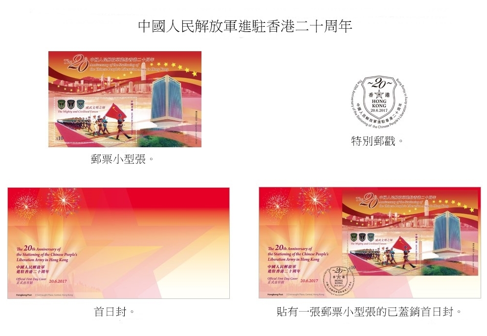 香港郵政發言人表示,駐港部隊自1997年7月1日進駐以來,一直堅決貫徹「一國兩制」偉大方針,嚴格按照《基本法》、《駐軍法》,依法在香港特別行政區履行防務職責,維護國家主權、統一、領土完整和香港的安全。為慶祝中國人民解放軍進駐香港20周年,香港郵政特別發行一張郵票小型張。