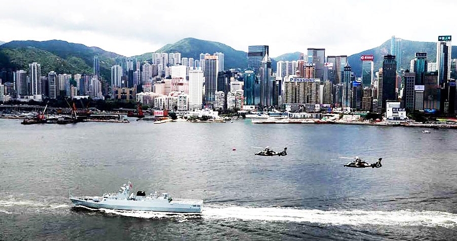 解放軍駐港部隊的导弹护卫舰「惠州艦」在维港巡邏,直升机尾随护航。