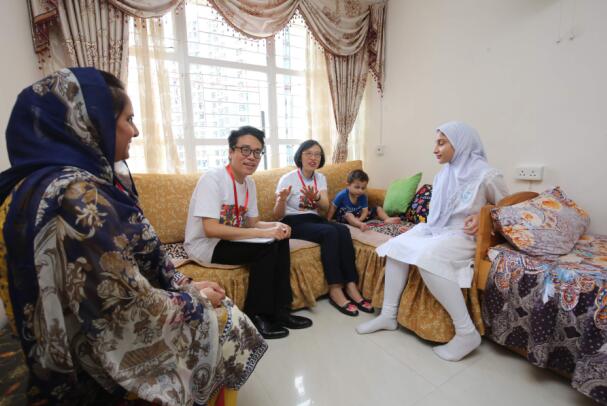 在元朗民政事務專員麥震宇(左二)陪同下,署理食物及衛生局局長陳肇始教授(左三)探訪居於天耀邨一個少數族裔家庭。