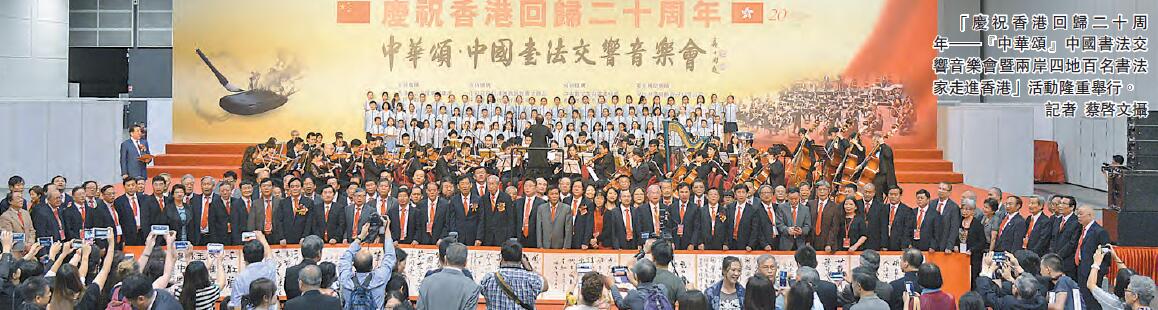 音樂會上,香港交響樂團演奏了《東方之珠》、《我是中國人》、《龍的傳人》等10餘首具中國特色的樂曲,書法家們在悠揚的音樂聲中即場共書長卷。最后,嘉賓、百位書法家與香港學生合唱團合唱《歌唱祖國》,將活動推向高潮。