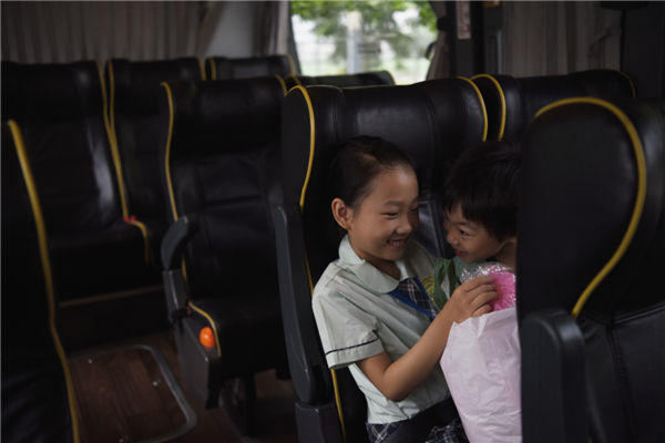 文菡(左)在“校巴”上和同学说悄悄话(5月12日摄)。
