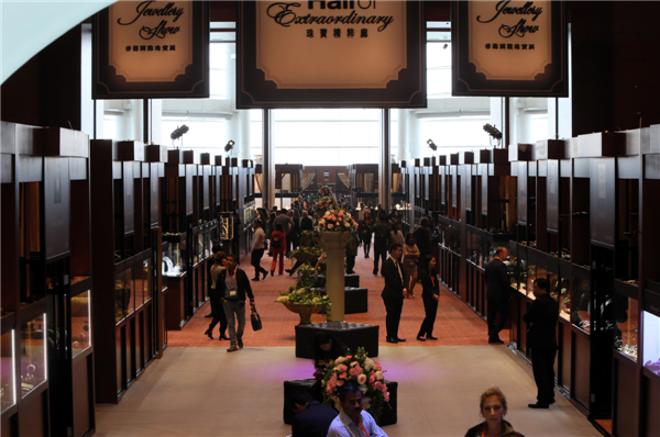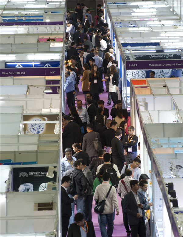 观众在亚洲国际博览馆举行的香港国际钻石、宝石及珍珠展上参观(2014年3月3日摄)。