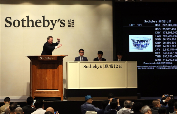 这是在会展中心举行的苏富比香港2017年春季拍卖会现场(4月5日摄)。