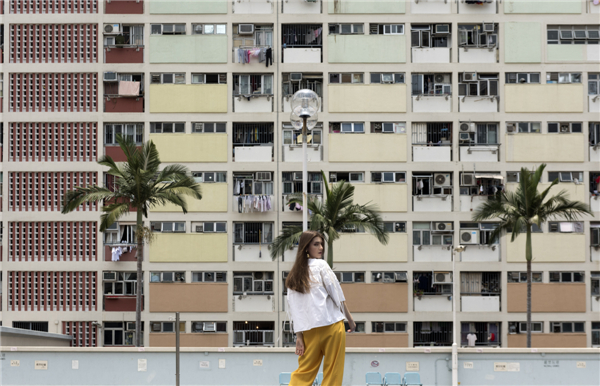 一名模特在香港九龙彩虹邨拍照(5月17日摄)。