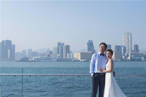 一对情侣在香港中环海滨拍摄婚纱照(5月28日摄)。