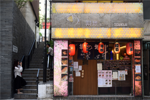 市民在香港中环一家日式商铺旁拍照(5月5日摄)。