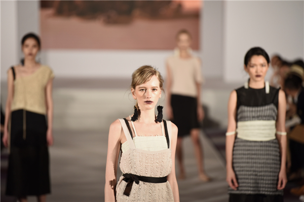 模特在香港理工大学纺织及制衣学系毕业生针织时装作品展上展示设计作品(5月17日摄)。