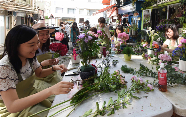 几名女孩在香港上环一家花店外练习插花技巧(5月27日摄)。