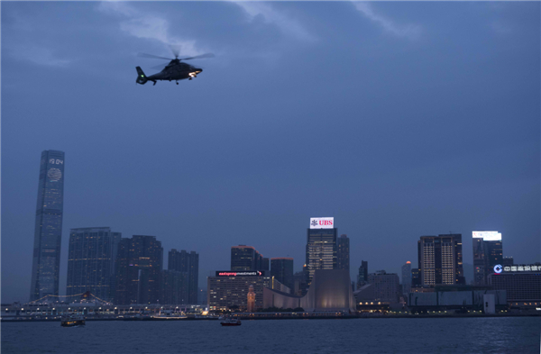 一架直升机飞行在香港维多利亚港上空(5月18日摄)。