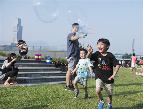 两名儿童在香港中环海滨玩耍(5月28日摄)。