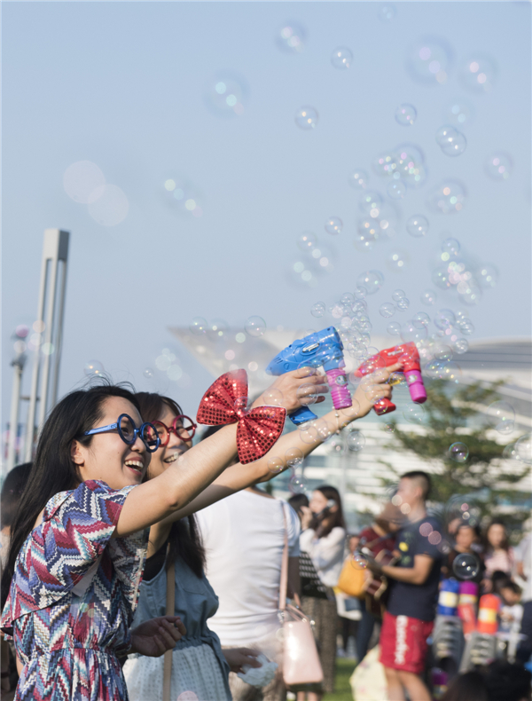 两名女孩在香港中环海滨游玩(5月28日摄)。