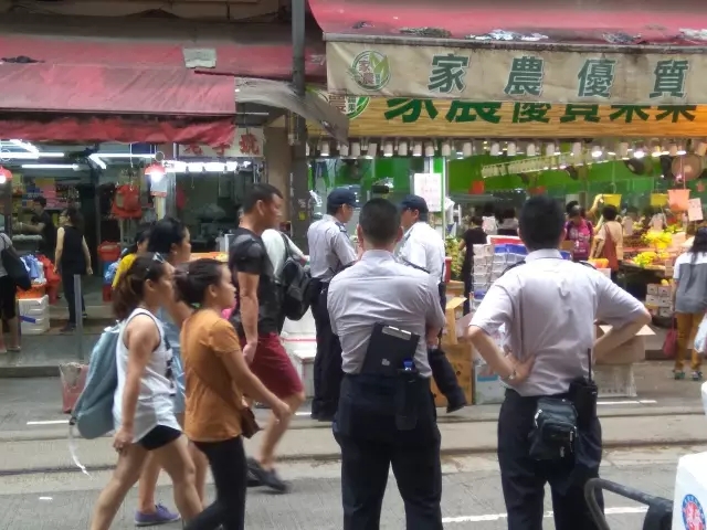 旁边,食环处工作人员正在劝导摊档把篮子往里头挪一挪,别太占道。