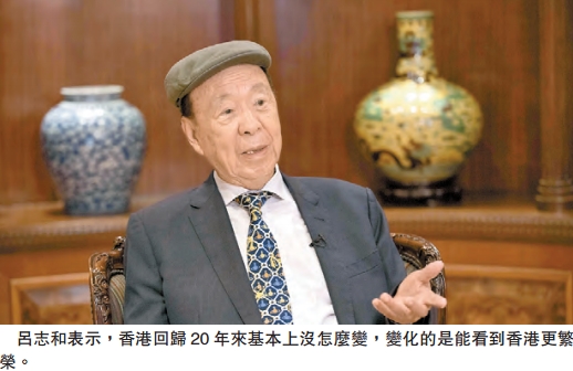 回顧這20年來的發展,呂志和認為,香港在金融、商貿、旅游及交通等方面有很大進展,加上完善的法律制度,使得國際地位大幅提升,「目前除了紐約、倫敦,就是香港了。如果不是背靠祖國,香港也不會如此強大,香港人是得益的,應該多謝內地。」他笑說,言語中透着質樸。