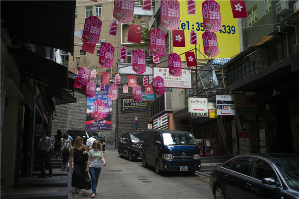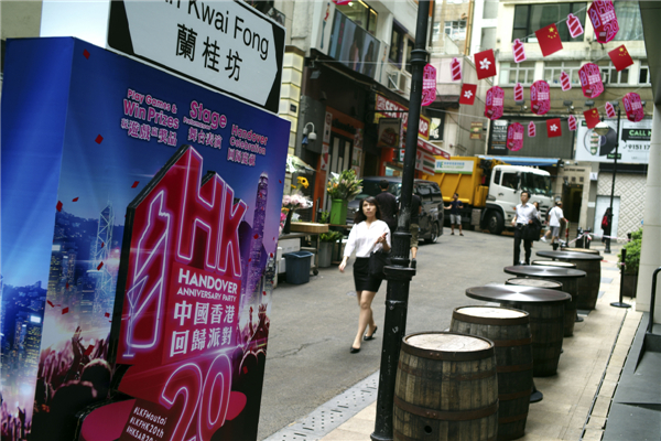 6月27日,香港兰桂坊,商家悬挂旗帜宣传其香港回归20周年派对活动,香港庆祝回归祖国20周年气氛渐浓。中新社