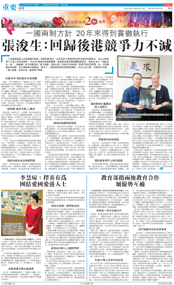 他說:「為什麼要採取『一國兩制』的方針?是根據香港的歷史和現實的需要,也是我們國家安全穩定發展的需要。對『一國兩制』的貫徹,一不動搖、二不變形、三不走樣。在這個方針之下,香港20年來經濟上總體在不斷的提升,作為國際金融貿易航運的中心沒變,國際上認為是最自由的經濟體,連續23年全球第一,就是說回歸前三年、回歸後的20年,還是全世界最自由的經濟體,也是國際上最具競爭力的城市。世界銀行有個指標,發表有關數據表示香港在政治穩定、政府效能、社會法治、公民表達及問責等方面的指標都遠遠高於回歸前。」