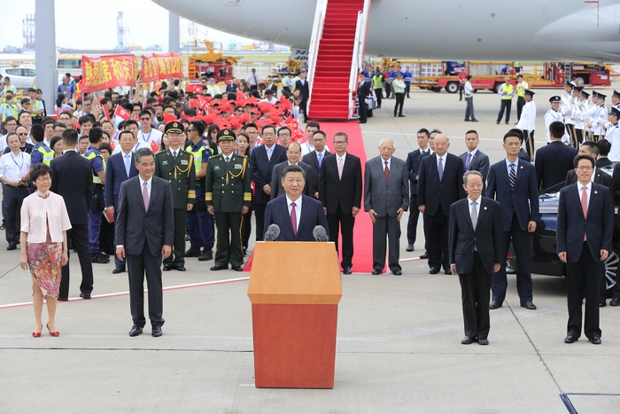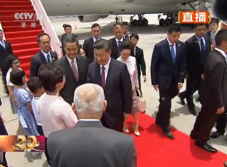中午12时许,习近平乘坐的专机徐徐降落在香港国际机场。习近平和夫人彭丽媛走出舱门,向欢迎的人群挥手致意。香港警察乐队奏响热情喜庆的欢迎曲,现场顿时沸腾起来。在舷梯旁,两名香港少年向习近平和彭丽媛敬献鲜花。在香港特别行政区行政长官梁振英和夫人梁唐青仪陪同下,习近平和彭丽媛同前来迎接的人员亲切握手。机场上,数百名各界群众代表挥舞手中的国旗、区旗和鲜花,热烈欢迎习近平的到来。