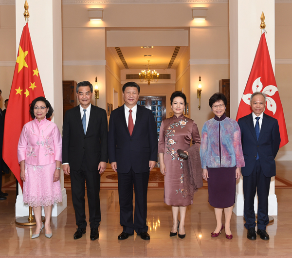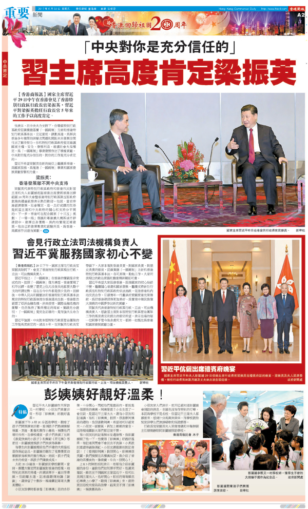 梁振英代表特別行政區政府和香港市民對習主席和夫人彭麗媛蒞臨香港出席慶祝香港回歸祖國20周年大會暨香港特別行政區第五屆政府就職典禮并視察表示熱烈歡迎。他說,當前香港經濟發展,社會穩定,這一良好成績的取得是同習主席和中央政府的關心和支持分不開的。下一步,香港可在配合國家「十三五」規劃、「一帶一路」倡議和粵港澳大灣區城市群建設中,發揮自身優勢,與內地實現互補發展。他自己將發揮專業和經驗所長,為香港、為國家作出應有貢獻。