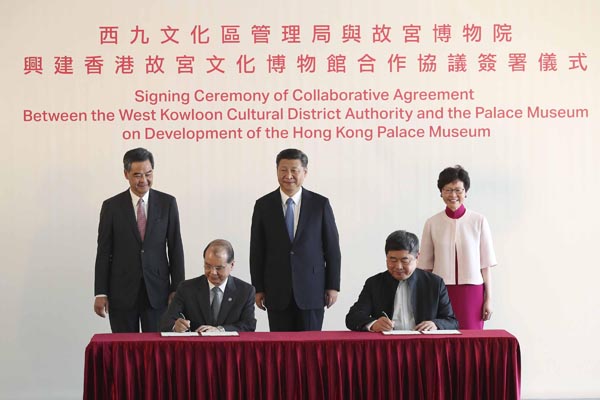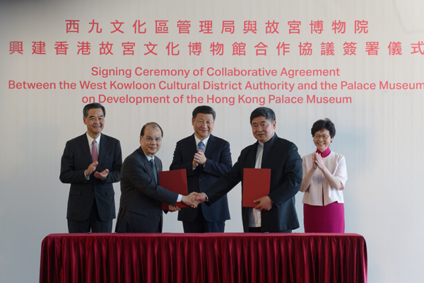 習近平昨於簽署儀式前,聽取了西九文化區規劃和香港故宮文化博物館選址建設等情况的介紹。他表示,西九文化區項目是幾屆特區政府接力推進的一項重點工程,它的建成將為廣大香港市民提供一個方便舒適的文化娛樂場所,也有利於促進香港文化創意產業發展,還將豐富香港國際都會的文化內涵,增加中西合璧的城市文化魅力。希望香港弘揚中華優秀傳統文化,發揮中西文化交流平台的作用,推動同內地的文化交流合作。