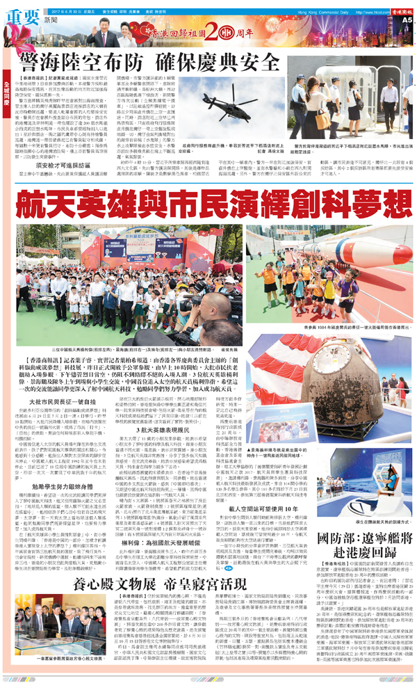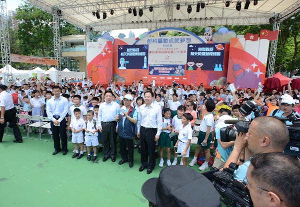 【香港商報網訊】記者葉子睿、實習記者葉柏希報道:由香港各界慶典委員會主辦的「創科驅動成就夢想」科技展,昨日正式開放予公眾參觀,由早上10時開始,大批市民扶老攜幼入場參觀。下午尽管烈日當空,仍阻不到絡繹不絕的入場人潮。3位航天英雄楊利偉、景海鵬及陳冬上午到場與小學生交流,中國首位進入太空的航天員楊利偉指,希望這一次的交流能讓同學更深入了解中國航天科技,勉勵同學們努力學習,加入成為航天員。