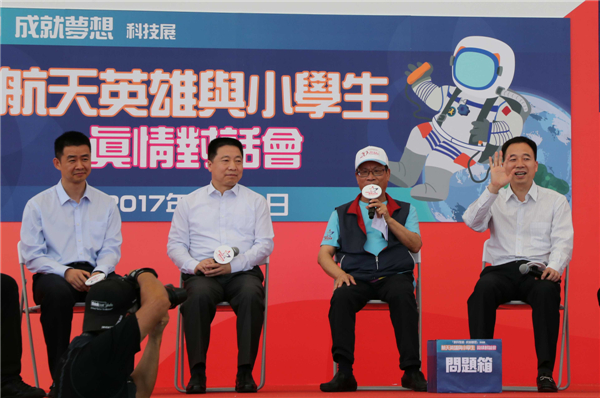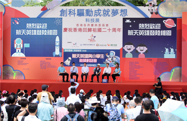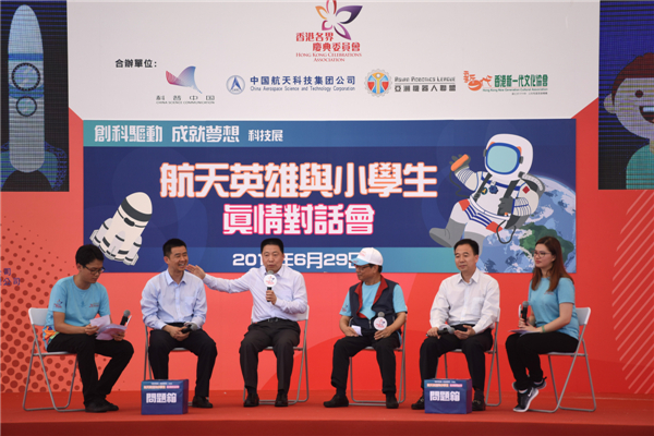 6月29日,航天员杨利伟(左三)、景海鹏(右二)、陈冬(左二)与香港小学生互动。当日,在香港维多利亚公园举行的“创科驱动 成就梦想”科技展上,航天员杨利伟、景海鹏、陈冬与香港小学生互动,回答关于航天科技的各种问题。新华社记者 秦晴 摄